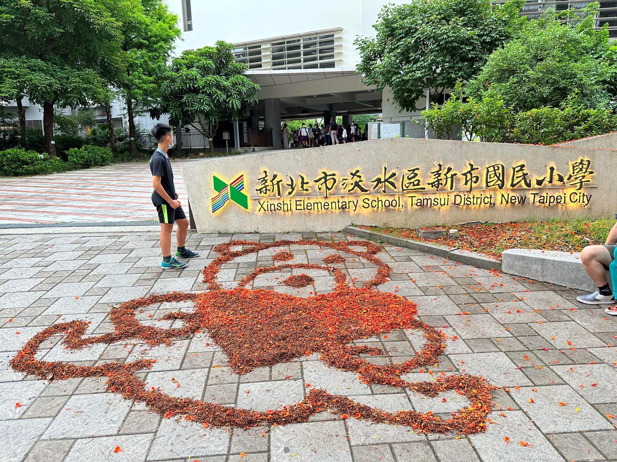 新北市淡水區新市國小程姓警衛,因為畢業季鳳凰木掉落花朵與落葉特別多,就用掃把將樹葉排列成各種造型可愛的圖案,包括卡通人物布丁狗、凱蒂貓,史努比等,讓每天上學的學生相當驚喜,稱讚他是深藏不露的藝術家。
