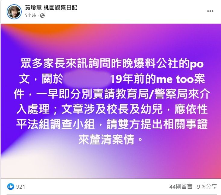 台灣MeToo風潮仍在延燒,一名男網友昨(19日)於臉書社團「爆料公社」發文,爆料19年前就讀桃園某幼稚園時,遭校長性騷擾,還被迫以競賽活動名義,在全校同學前脫光衣服,園方對此發布聲明駁斥,並報警提告。桃園市教育局今(20日)表示,已與當事人聯繫提供事證,將由調查小組盡速完成調查,如經查屬實,則提報性騷擾防治委員會審議,強調即使時間久遠,若有違規將進行懲處,絕不寬貸。