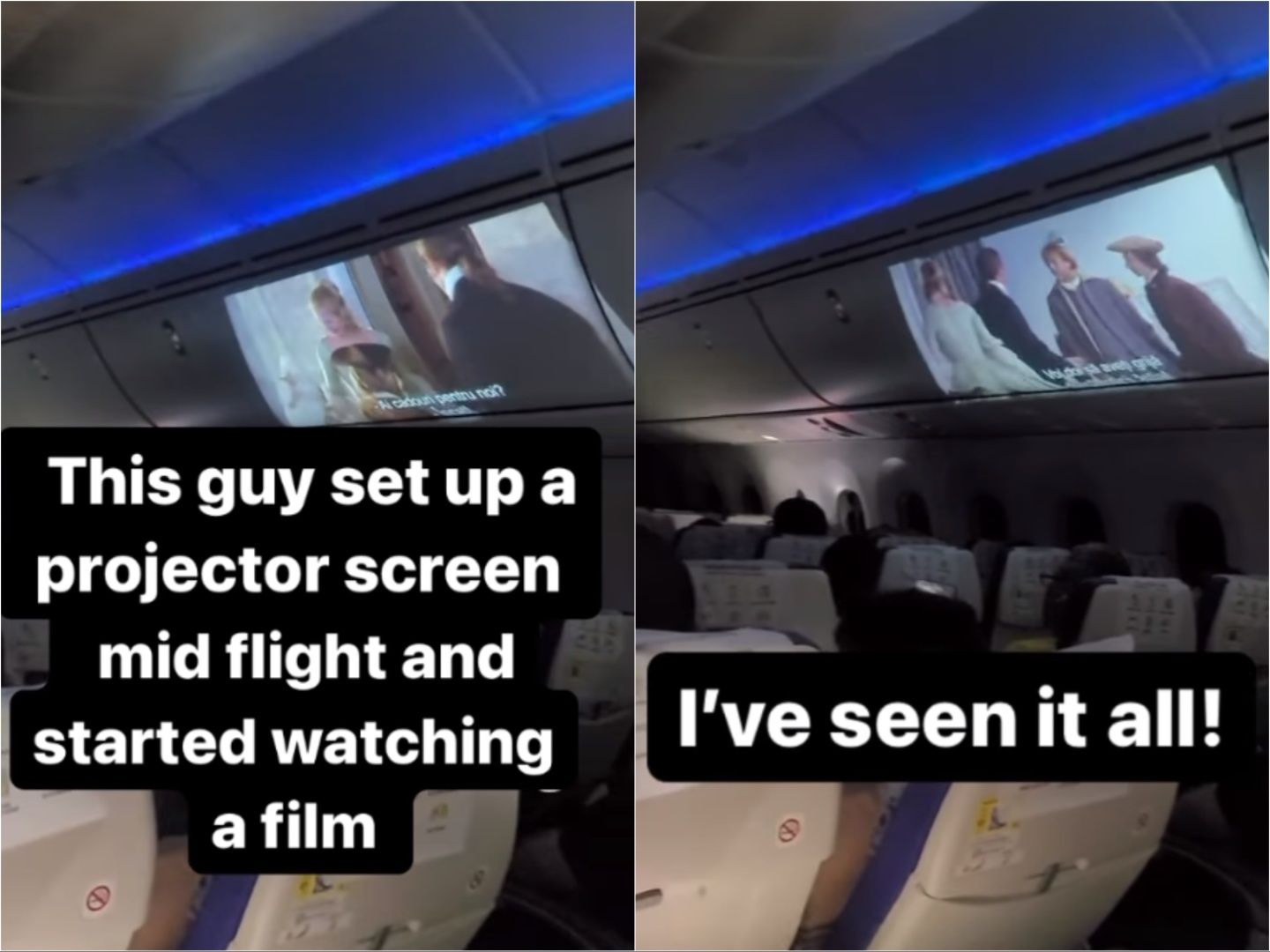 綜合外媒報導,乘客拉齊柯克(Douglas Lazickirk)搭機時遇到同班機乘客將電影投映在行李置物櫃,他認為是有趣的經驗,而將過程拍下分享至IG,並稱「這傢伙設置了一個投影機,並開始在飛行途中播放電影」,還補充自己已看過這部電影了。