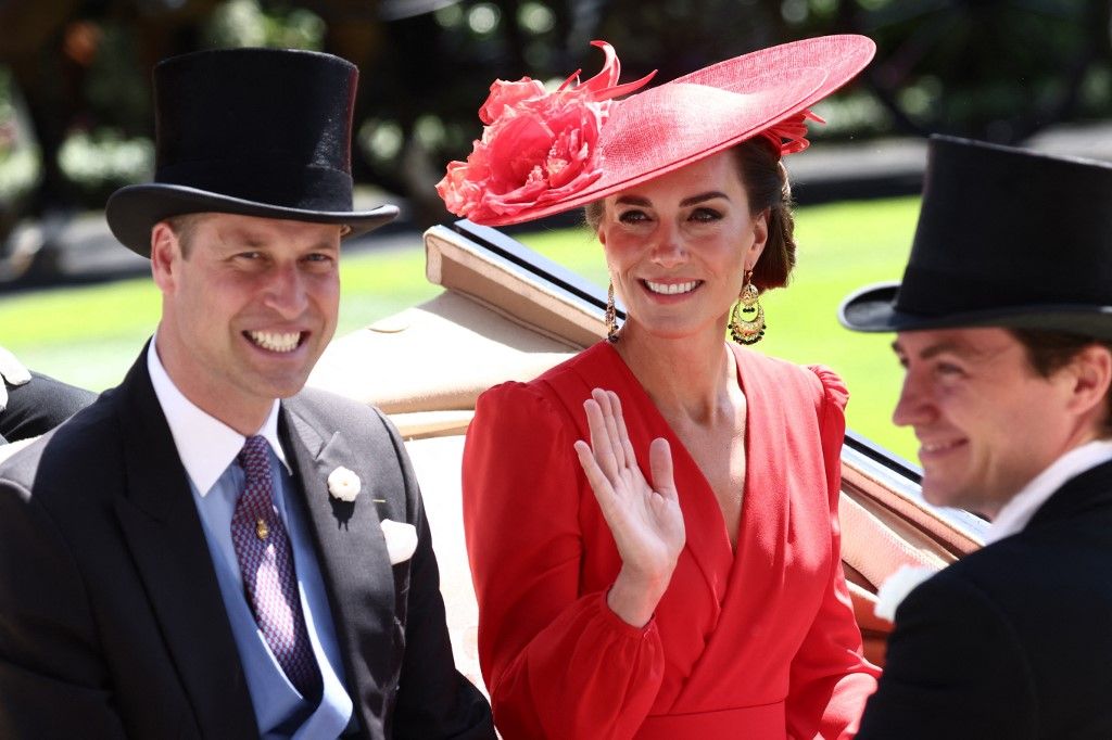 威廉王子與凱特王妃在23日乘著馬車亮相,參與這場盛事,夫妻2人都戴著帽子出現,威廉王子戴著高帽子,配上紫色領帶和淺藍色背心,打扮相當紳士。而凱特王妃則是「全身紅」現身,不僅是身上的洋裝,帽子、鞋子都是紅色,加上比賽場地是綠色的草皮,讓凱特王妃的紅色穿搭顯得更為亮眼,吸引全場目光。