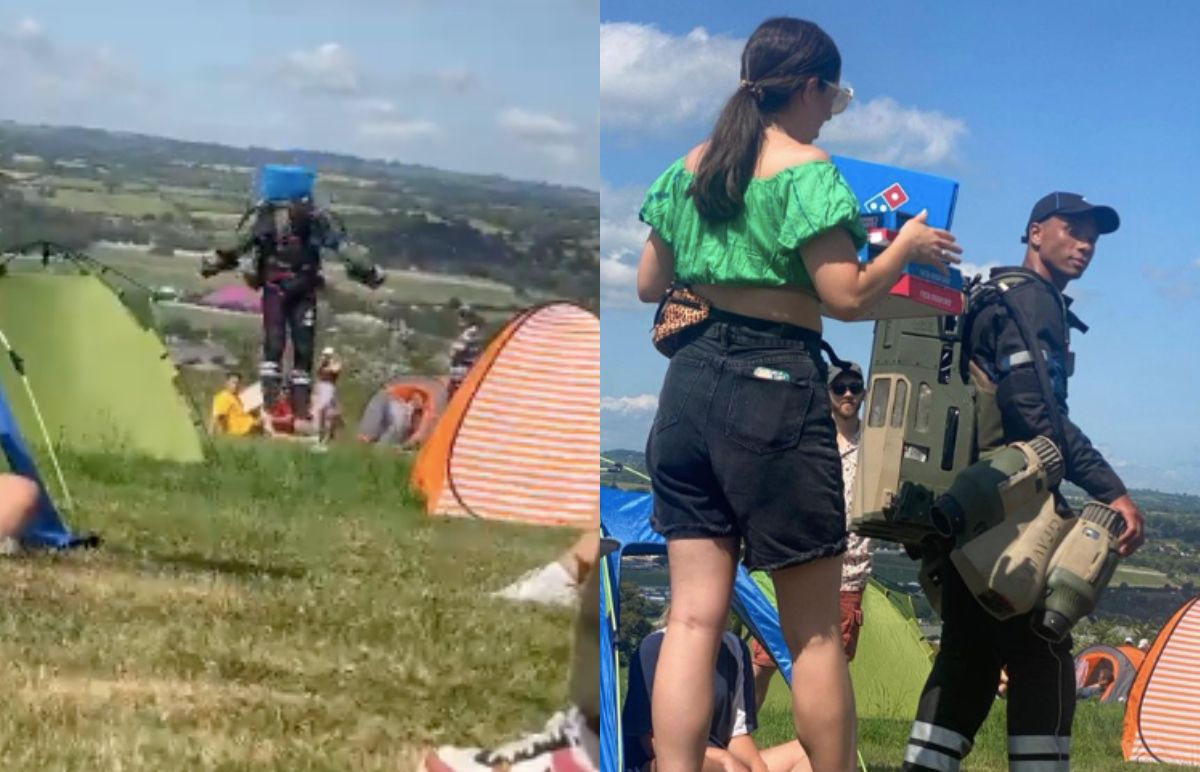 英國達美樂披薩近日和研發噴射背包的公司「Gravity Industries」合作,先讓外送員經過飛行訓練後,接著穿著噴射背包於格拉斯頓伯里當代表演藝術節(Glastonbury Festival)外送披薩,今年音樂節於21日舉行,一連歡慶6天,噴射外送也意外成為這個世界最大的露天音樂節活動最吸睛的畫面。