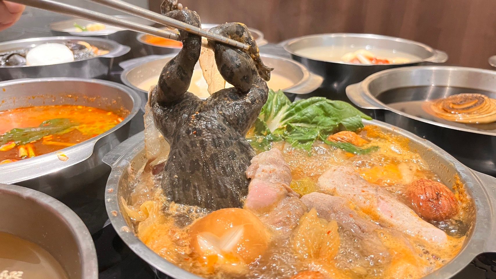 「青蛙火鍋」噱頭十足,不過連皮帶肉一起丟進火鍋的煮法,掀起網友討論「不是要剝皮嗎」、「沒有整隻丟的吧,要先去皮」、「帶皮的我真的不敢了」。