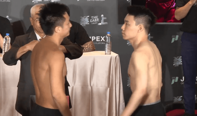 原來兩人過磅後,主辦單位邀請兩人面對面在場中對峙,原本只是要作效果,不料雙方之間火藥味卻越來越濃,當濃度突破臨界點時,鍾培生先動手賞Toyz一巴掌再推他,此舉也惹惱Toyz作勢上前回擊,眾人見狀趕緊將兩人拉開,避免更大衝突發生。
