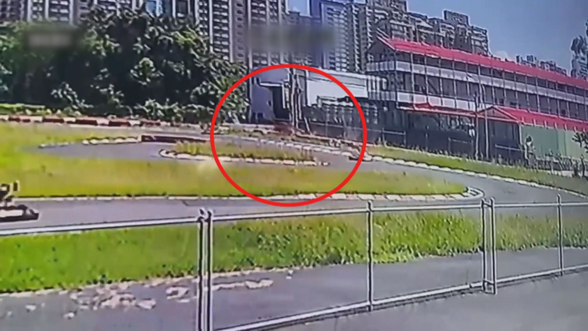 從畫面中可以看到,右方是一座卡丁車的賽車場,駕駛行駛經過這個路段時,一輛紅色卡丁車,突然朝著大馬路衝出來,從另一個角度看,賽車場內有多台賽車,高速繞著跑道行駛,其中一輛紅色卡丁車在轉彎時,因不明原因失控,直接越過彎道邊界,筆直地朝場外衝,強大的力道衝破鐵網,撞擊路過的保時捷後才停了下來。