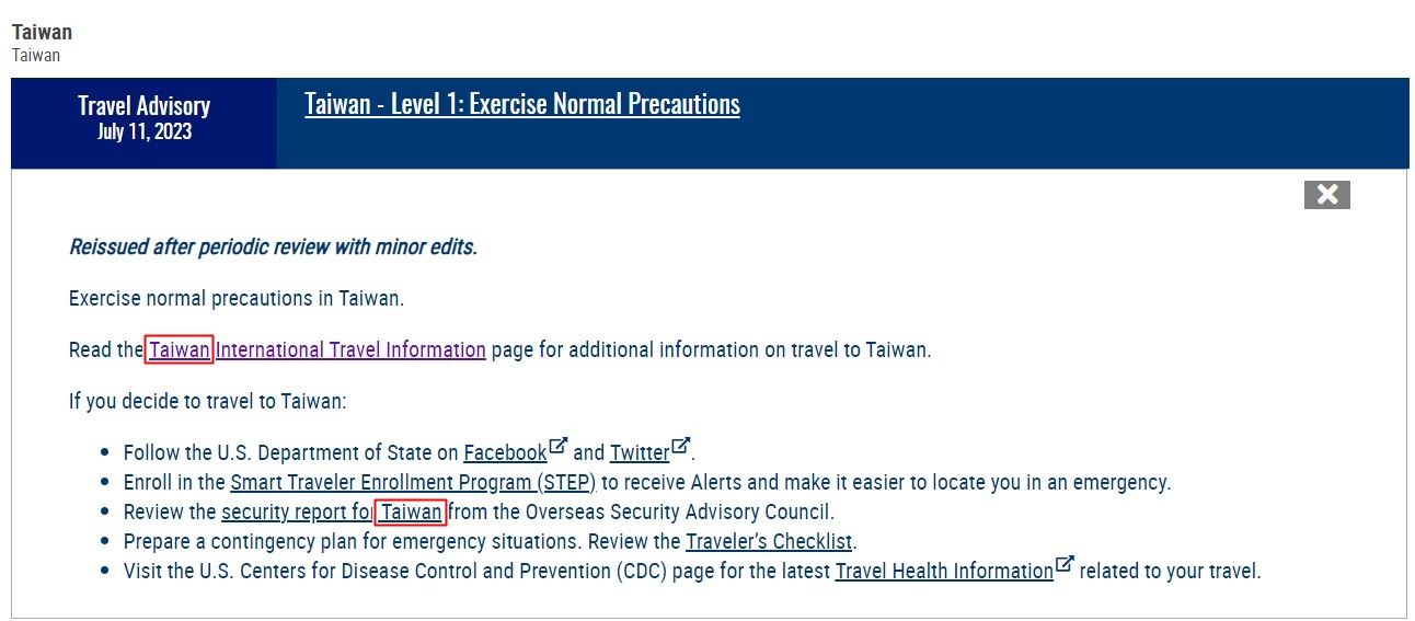 去年的版本中,國務院建議欲前往台灣的旅客,可上「國家訊息網頁」(Country Information Page)查詢更多資訊,也可以查看台灣的「國家安全報告」(Country Security Report for Taiwan)。