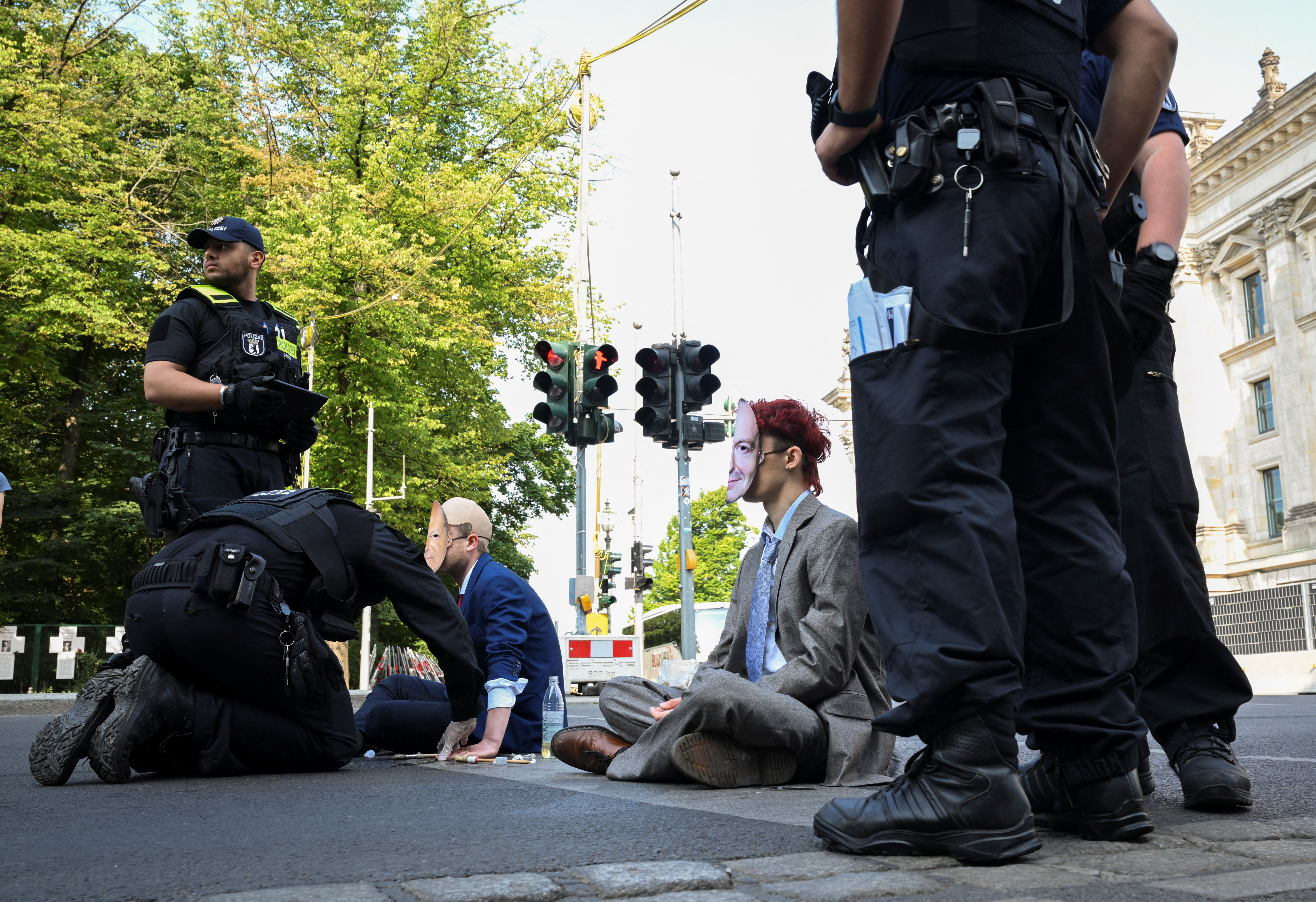 抗議民眾高舉著還黏著一塊馬路碎石的手,一旁挖路工人則努力用電鑽弄碎柏油路,好把躺在馬路上的環保人士趕走,還有人故意戴著德國總理蕭茲,以及德國交通部長、和環境部長等人的面具,躺在馬路上,當這些環保人士、被警察硬拖走時,他們還會發出哀號。