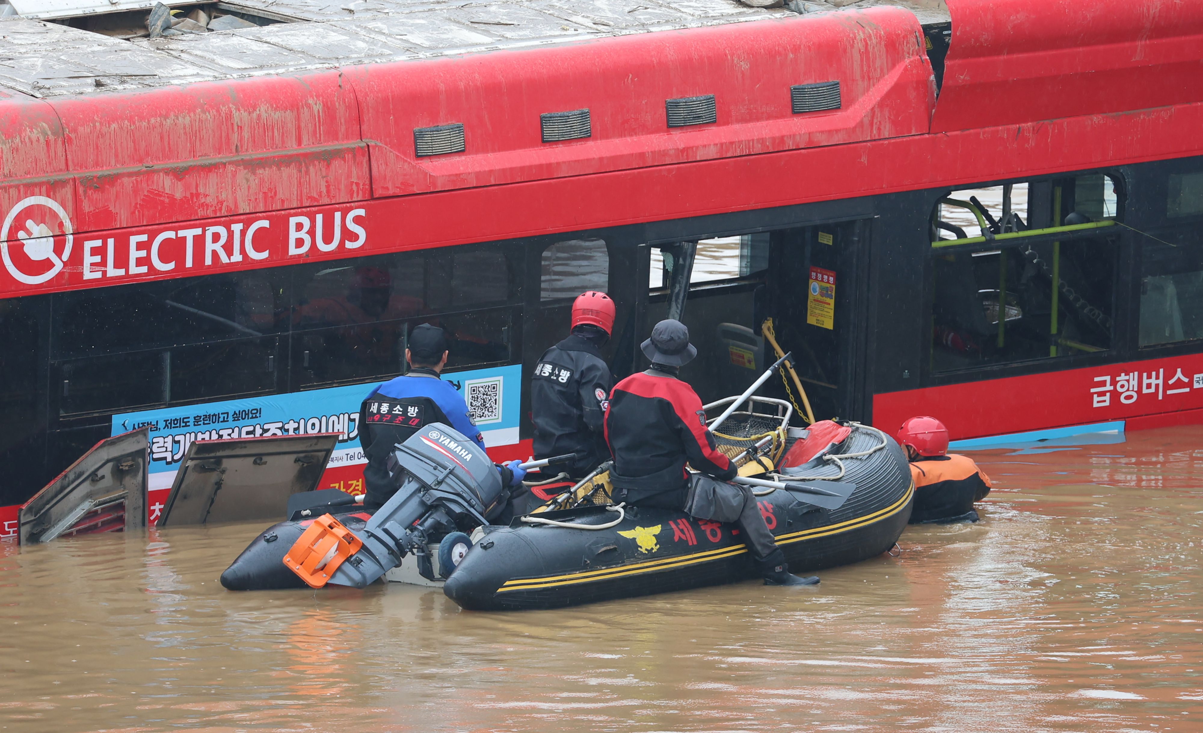 忠清北道清州市五松邑宮坪里一處地下道15日因周邊河川暴漲,短時間湧入約6萬噸水遭滅頂,有15輛車受困,包含1輛載有約10位乘客的公車、2輛卡車,以及12輛轎車,警消趕赴現場排水救人。