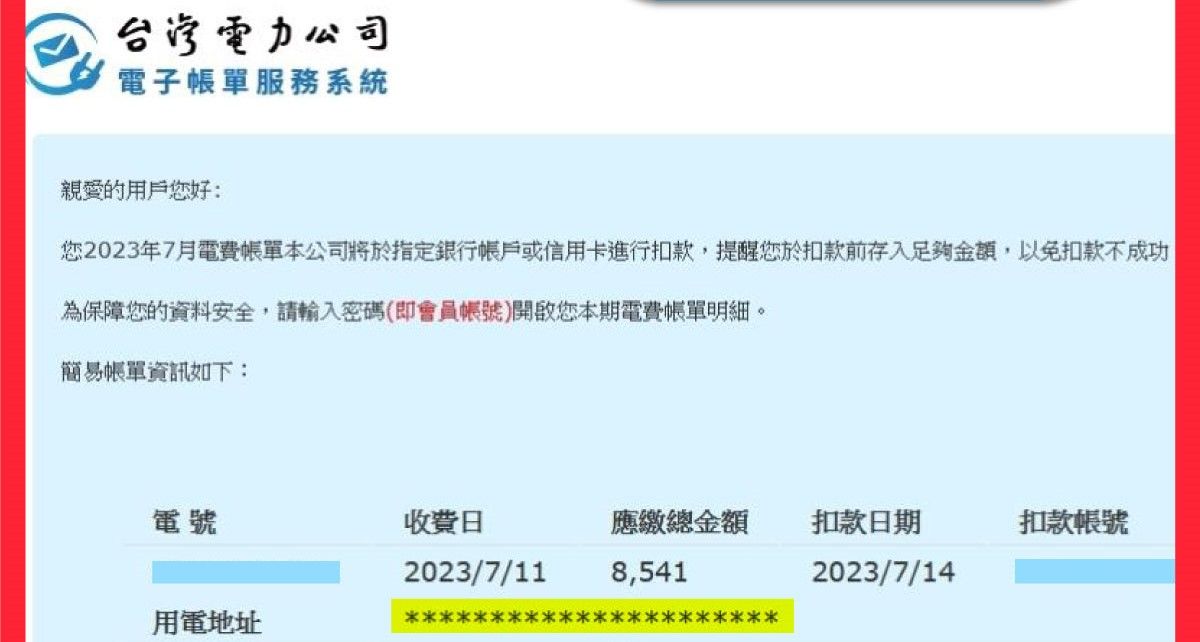 台電指出,近期發現有假電費帳單的詐騙手法,類似詐騙釣魚的e-mail有3大特點,包括信件標題將電號遮罩、信件內容無法提供用電地址,以及附件為ZIP壓縮檔案(含有害的程式檔)等。