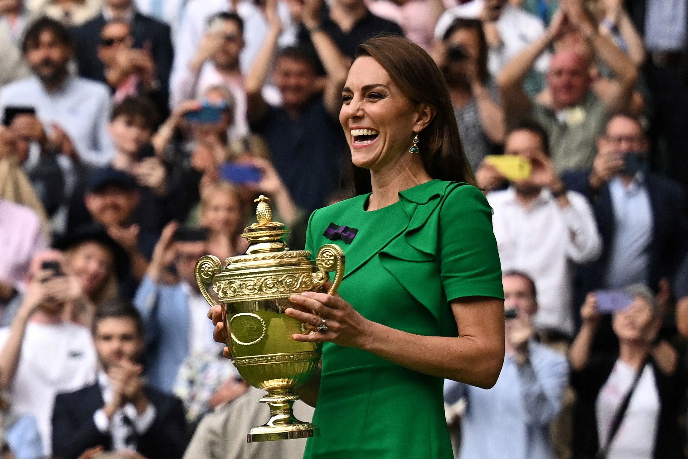 凱特王妃在英國時間16日出席溫布頓網球公開賽,她以英國設計師品牌Roland Mouret的綠色洋裝亮相,象徵溫布頓網球場的草地,這件洋裝要價英鎊750元(約新台幣3萬元),另外搭配Gianvito Rossi的米色高跟鞋和Emmy London的手拿包,以及綠瑪瑙耳環。