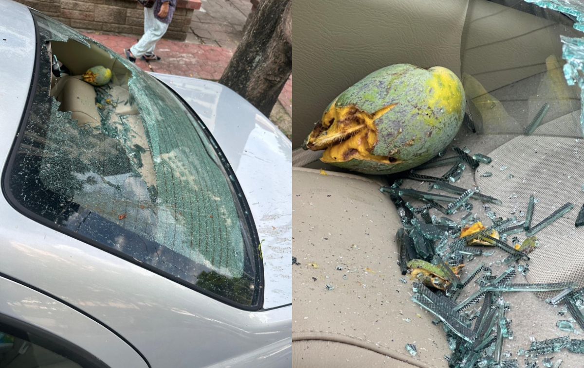 羅廷瑋釋出多張芒果樹落果砸傷小客車後車窗的現場照,只見厚實的後車窗,被重達1斤左右的芒果砸出一個大洞,玻璃碎片滿佈後座,也有擋風玻璃被砸出蜘蛛網紋,可見力道之大。