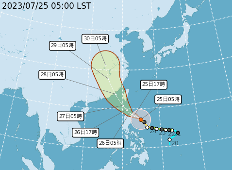 今年第5號中度颱風「杜蘇芮」,清晨5時中心位於鵝鑾鼻東南方670公里的海面上,以西北轉西北西方向朝台灣南端近海前進,昨(24日)晚間已發布海上颱風警報,預計今日下午4時許發布陸上颱風警報,今日晚間10點暴風圈進入台灣近海,明日上午進入台灣陸地。週三、週四(26日、27日)颱風中心將沿著台灣西南方近海北上,這兩天也是颱風影響台灣最明顯的時候,請民眾做好防颱準備,留意氣象局的最新預報。