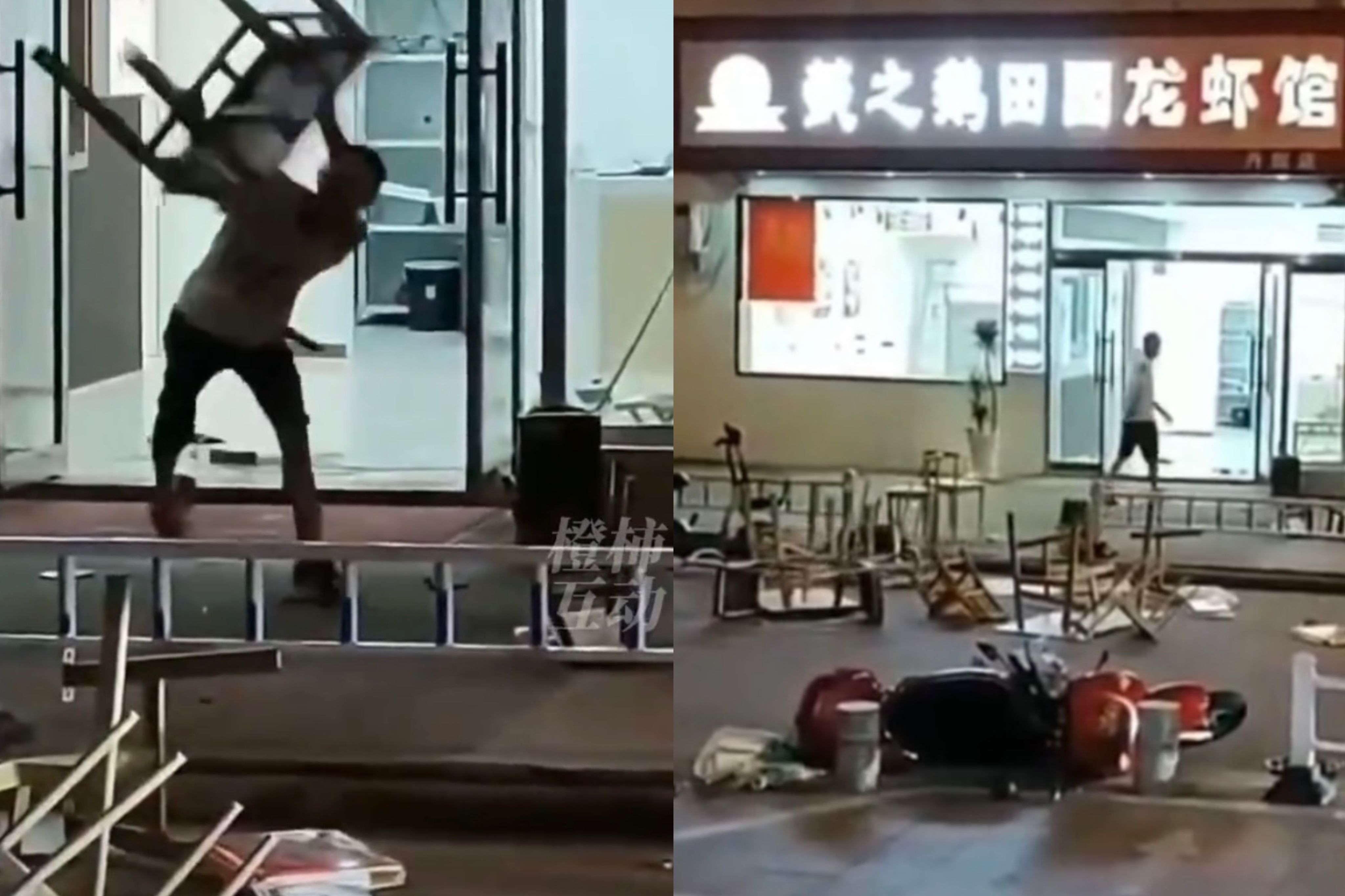 中國江蘇一家龍蝦餐廳近日發生砸店事件。有網友在深夜拍下這段影像,一名男子在某家龍蝦餐廳外不停地舉起店內桌椅重摔在地,店門口一片狼藉,事後警方到場處理,才發現原來該名鬧場的男子,竟然是餐廳老闆,疑似因為生意難做,賺的錢不夠繳店面租金,一時崩潰才會砸毀自己開設的餐廳。