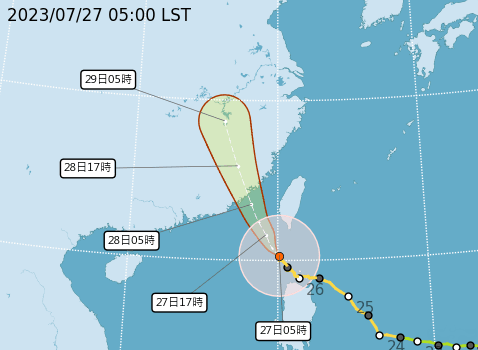明(27日)起颱風影響最明顯,各地皆有短暫陣雨,並有大雨或豪雨發生的機率,除了東半部、恆春半島仍有短延時強降雨外,強降雨熱區也逐漸擴大到南部地區,尤其在花東地區及南部山區可能有大豪雨等級的降雨出現,此外,中部地區及北部山區停雨空檔也逐漸減少,不時有短暫陣雨,只有在北部平地雲量稍多;氣溫方面,各地高溫約29到33度之間,但受颱風外圍沉降影響,桃園到彰化及金門局部地區氣溫仍有機會高1到2度左右,外出請多補充水分。