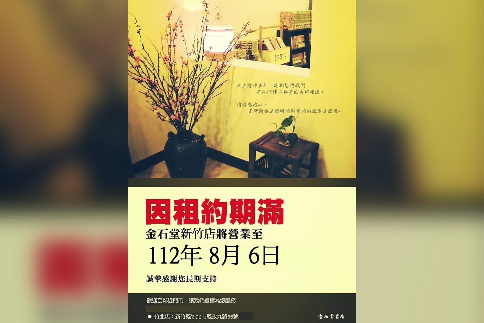 而位於新竹的分店今(27日)也透過臉書表示,「謝謝所有曾經來過金石堂新竹店的朋友,天下無不散的宴席」,同樣因租約到期將只營業至8月6日。店家感慨寫下「實體書店真的越來越少了,會不會有一天,它消失了?而書店帶給我們的回憶是什麼呢?」也呼籲「實體書店需要你的支持,就算資訊如何的進步,能在一個你喜歡的書店,細細的品味一本你喜歡的書,是一件很幸福的事」。