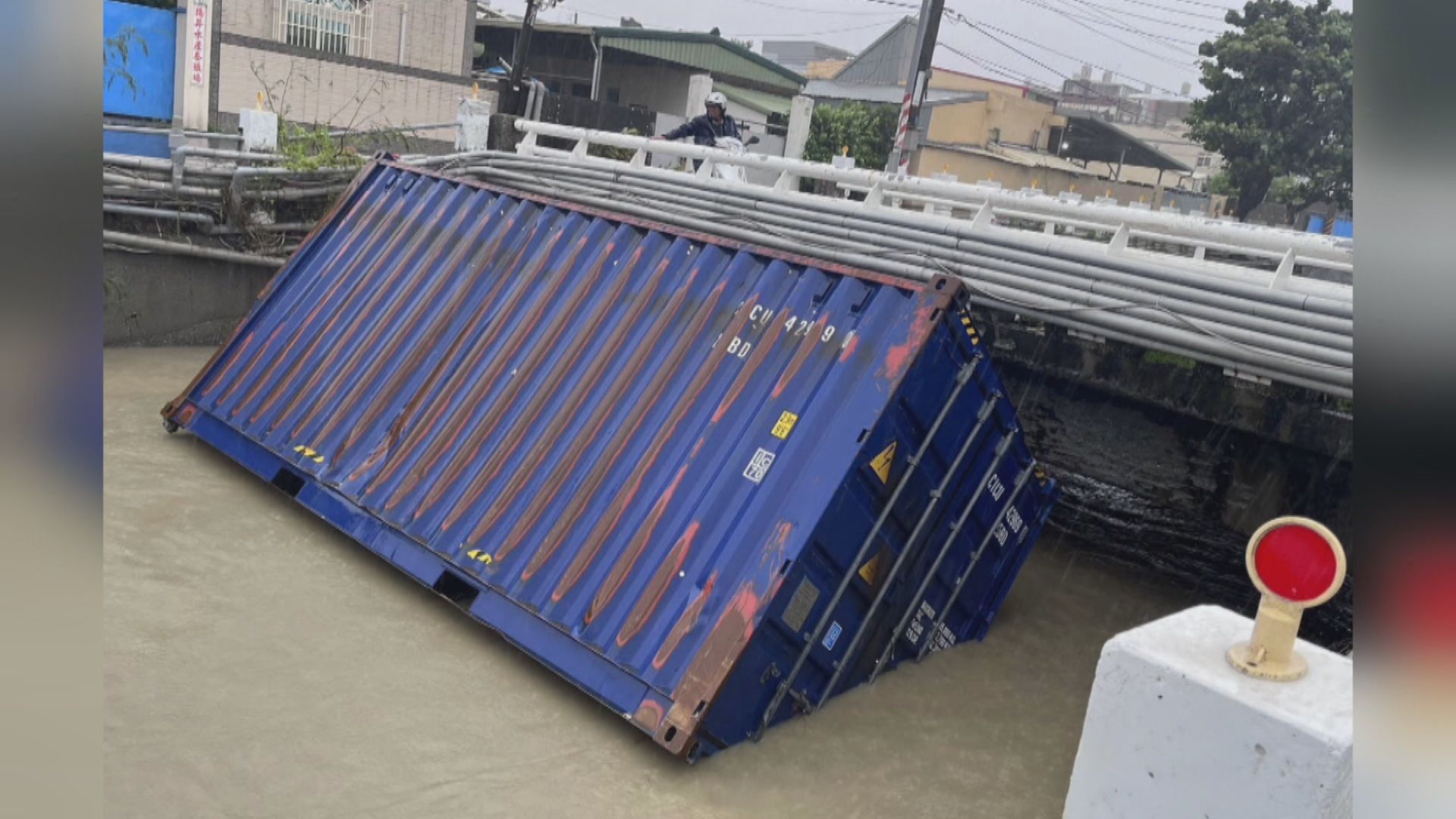 透過畫面可以看到,藍色貨櫃載浮載沉卡在橋下,有民眾(28日)早上8點40分,跟港務公司通報,高雄市林園區中門三號橋下發現有漂流貨櫃,港務公司立即調度吊車前往處理,11點10分左右已經將貨櫃吊離。颱風來臨前,在沉沒郵輪周邊佈設的攔油索,因為風浪過大受到破壞,港務公司也會進行再進行佈設。