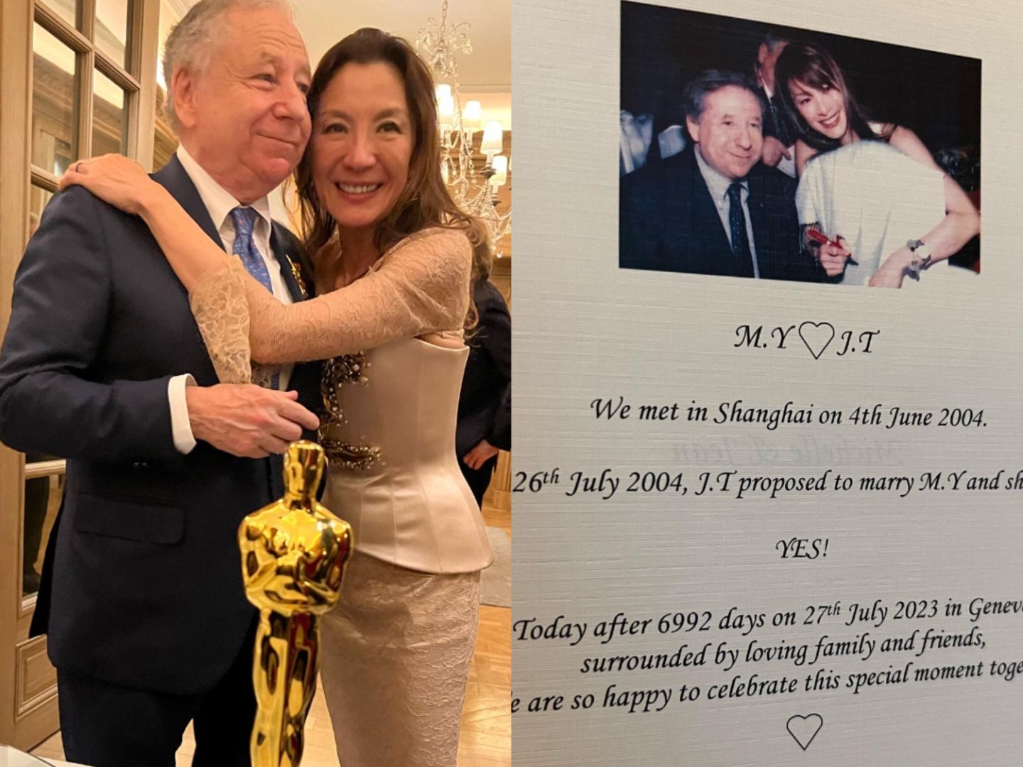 奧斯卡首位亞裔影后楊紫瓊昨(27日)與愛情長跑19年的前法拉利總裁尚陶德(Jean Todt)結婚了,兩人於瑞士日內瓦在親友見證下結為連理,巴西賽車手馬薩(Felipe Massa)受邀參加,並於IG分享喜訊,祝福兩人婚姻幸福,楊紫瓊與丈夫的喜帖、婚禮造型也隨之曝光。