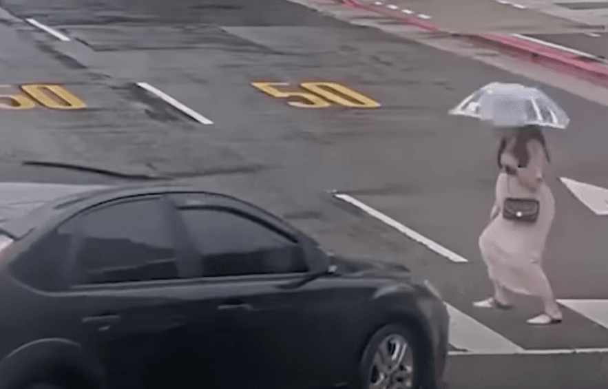 昨(5日)有民眾把監視畫面上傳YouTube頻道「WoWtchout - 地圖型行車影像分享平台」,只見身穿粉色長洋裝的孕婦,撐傘走在斑馬線上,一輛左轉的黑色小客車沒有減速跡象,孕婦見狀只能急忙跳開,小客車才緊急煞車,畫面十分驚險。