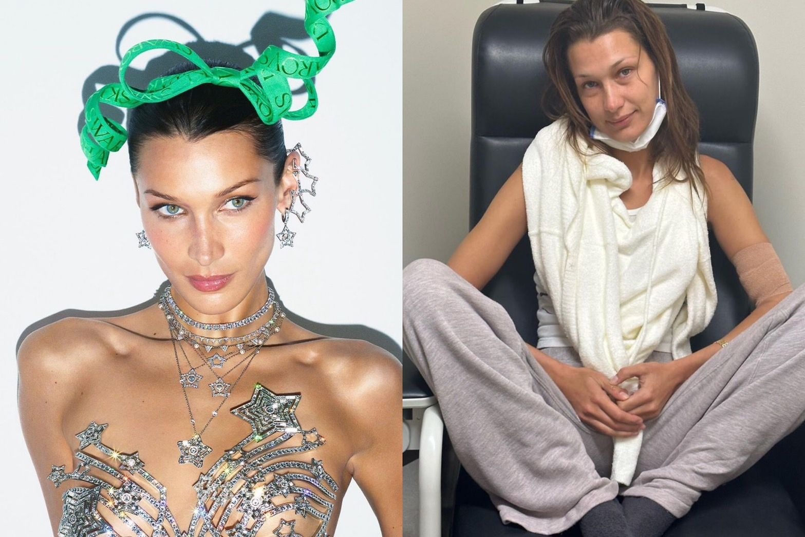貝拉哈蒂德(Bella Hadid)6日晚間透過IG說明近日消失幕前原因,她表示「生活在這種狀態下,隨著時間和工作的堆積而不斷惡化,同時試圖讓自己、我的家人和支持我的人感到驕傲,這對我的身心造成了無法解釋的傷害。」貼文中可見貝拉手臂插滿針孔和打點滴的照片,其中幾張醫療紀錄也顯示,貝拉出現極度疲憊、胸痛、肌肉、關節痠痛等症狀,而休養中的貝拉雖然露出淺淺微笑,但還是難掩疲憊和憔悴的模樣。