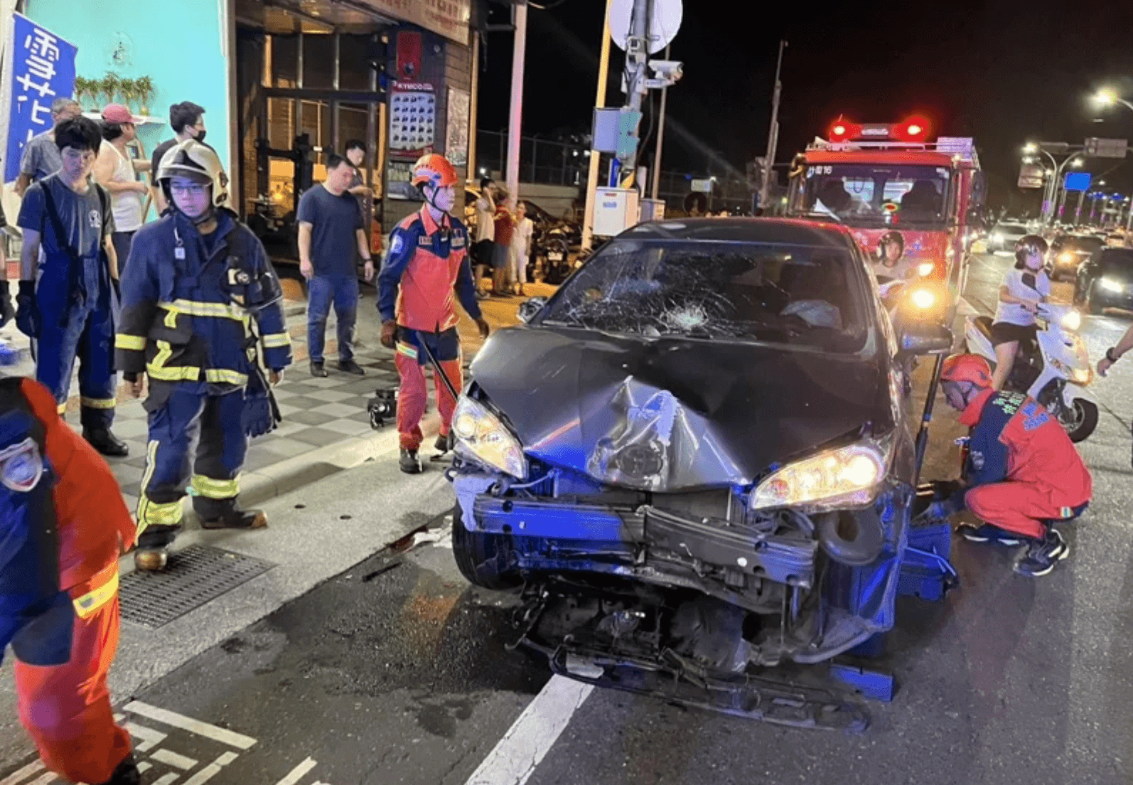 其中一名44歲的李姓男駕駛被捲進車底,拖行約30公尺,另外一台機車騎士則是嚇到自摔,騎士和乘客受傷。恰巧該處人行道上有機車停車格,鄧男車輛不僅撞上行進中的機車,路邊停放的機車也遭殃。