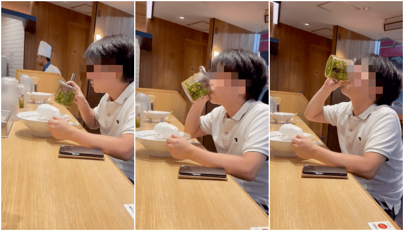 近日有日本網友在社群網站X貼出一段約8秒的影片,內容顯示在知名的連鎖拉麵店「どうとんぼり神座」的新宿某分店,一名身穿白色上衣的男性在用餐時,竟然直接拿起公用的韭菜水飲用,據悉該名網友立刻告知店員,不過店員疑似怕被客訴,所以不敢上前制止。