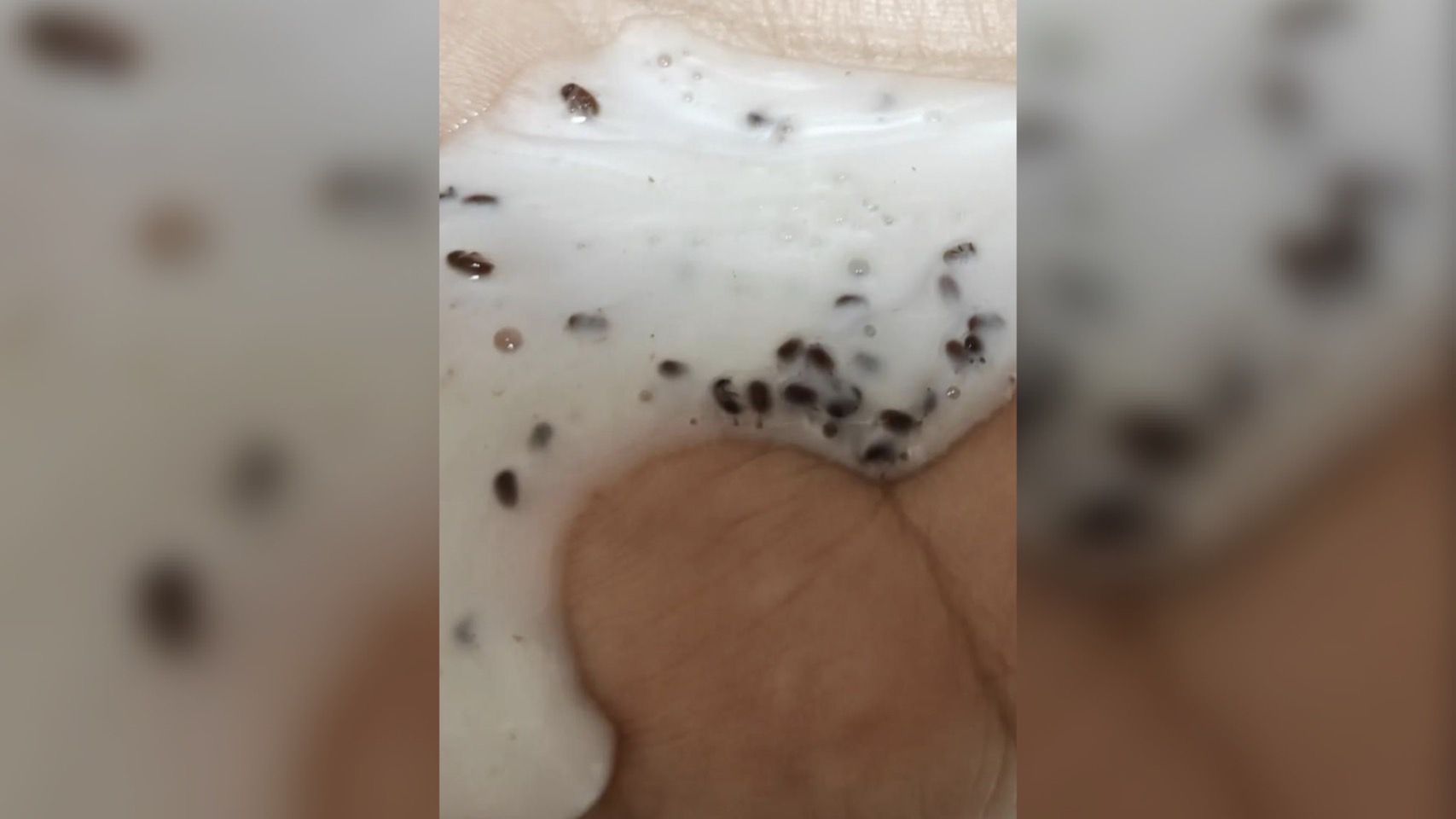 隨後,她將另一瓶洗髮精拿出來檢查,雖然兩罐生產日期不同,分別為今年3月和5月,到期時間則為2026年3月和5月,但同樣擠出大量棕色蟲卵,她表示洗髮精特別濃稠,「大概五六十隻,看著像蟑螂卵,放大看有頭有腳,太嚇人了頭皮發麻,我現在擠洗髮水都有陰影了」,噁心畫面讓孩子嚇到哭出來,連飯也吃不下。
