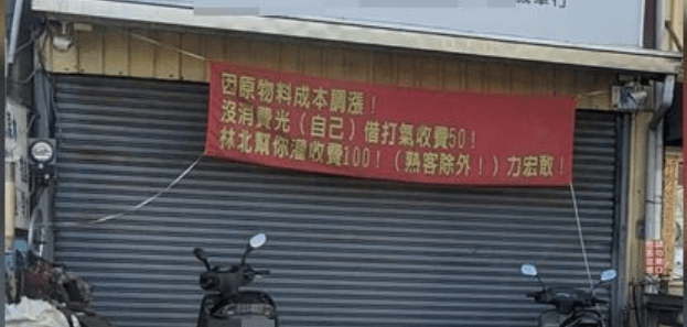 機車行是機車突然出問題時的救星,若遇上輪胎消風或是拋錨等小問題,部分老闆也願意協助處理,卻有不少民眾「方便當隨便」,20日一名網友在臉書社團「路上觀察學院」貼出一張照片,表示他經過某間機車行時,發現店門口掛著紅布條,上面寫道「因原物料成本調漲!沒消費光(自己)借打氣收費50!林北幫你灌收費100!(熟客除外)力宏敢」。