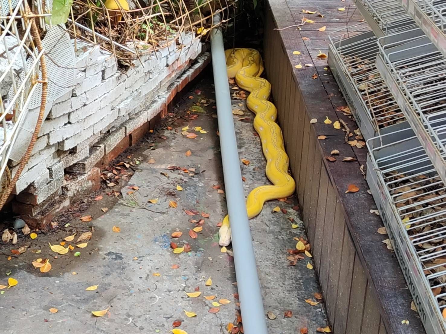 台北市鬧區驚見金黃巨蟒!一名婦人日前行經西門町電影主題公園時,被草叢裡的蛇嚇到連打110都無法,只能直奔警局報警,警方到場後也被體型龐大的蟒蛇震懾,隨即聯絡消防、動保處,才順利合作抓起,動保處今(23日)表示,初判是長約5公尺的網紋蟒,目前已取得飼主聯繫將被領回。