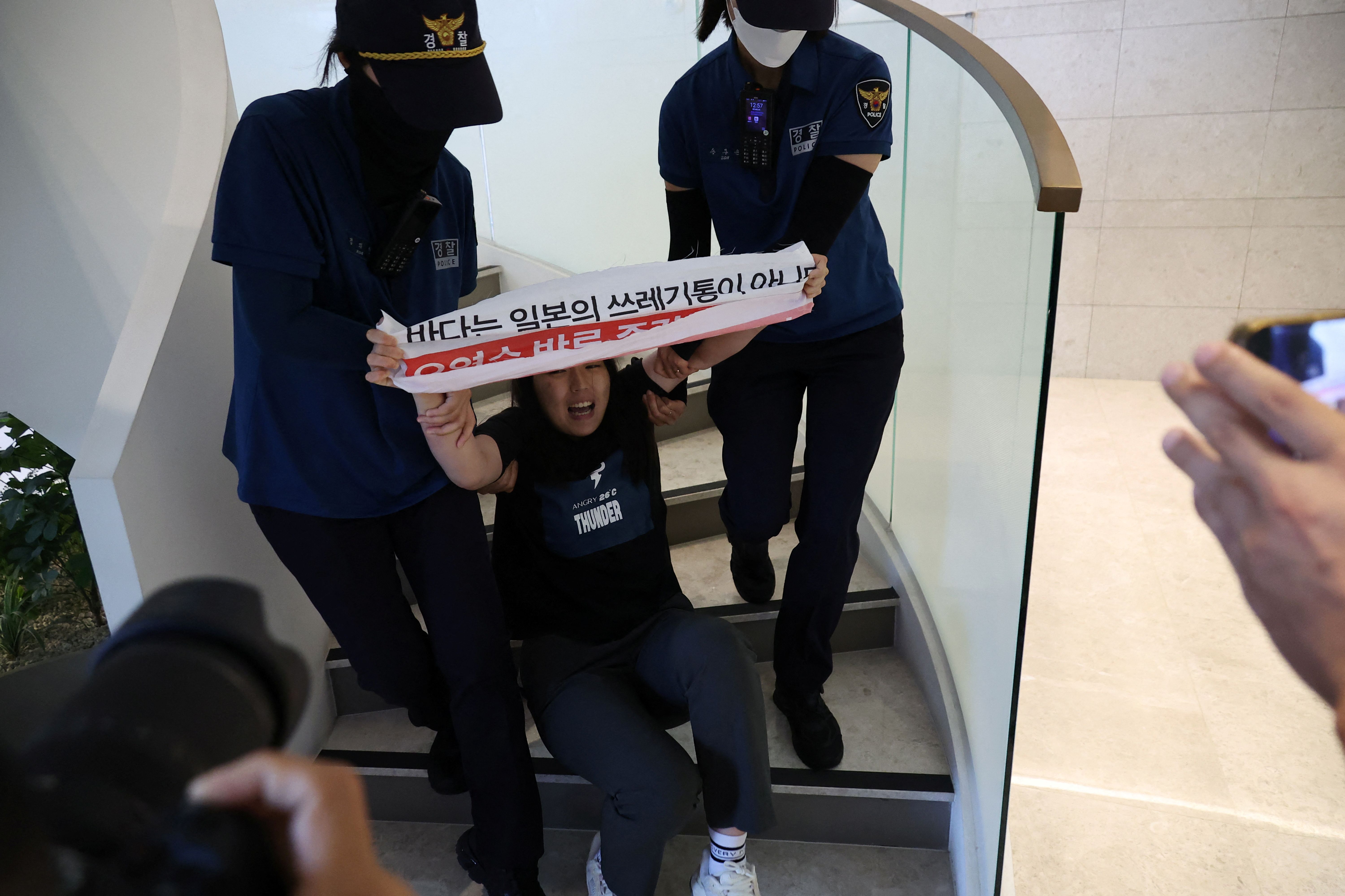 綜合韓媒報導,許多南韓民眾反對日本排放核廢水,當地5個大學生團體今組成「反對排放核汙水大學生考察隊」,到日本駐韓大使館前舉行記者會,隨後有將近50名學生進入大使館內,欲遞交抗議信,部分學生試圖掛上抗議橫條、海報,並高喊口號,警方獲報到場,將不聽勸的學生以抬或抱的方式強制驅離,有16名學生遭逮。