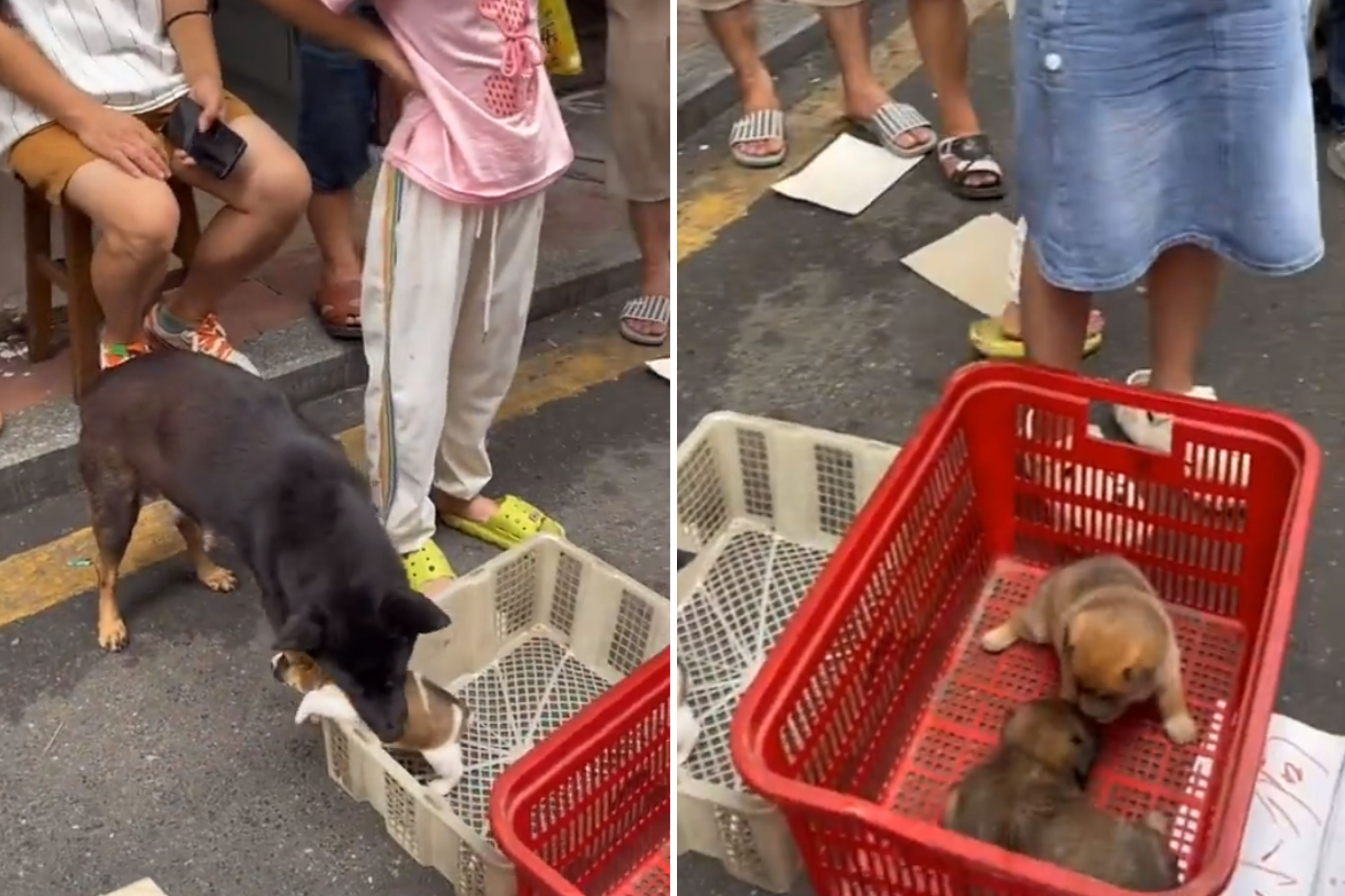 一旁目擊全程的男子將影片PO上網,他表示當時看到那幕很心酸,感嘆母愛真的很偉大,網友也紛紛留言,「看著牠一聲不吭,無奈的帶走自己的崽,淚崩」、「大狗夾著尾巴,看來是真的生氣了」、「為什麼要當著狗媽媽的面賣狗崽?」更有網友分享自身經驗,表示「賣狗可以,但不能一次全賣,我小時候家裡嫌狗崽太多,一次性清空了,狗媽媽幾天不吃不喝,叫了也不理,一直趴在那。」