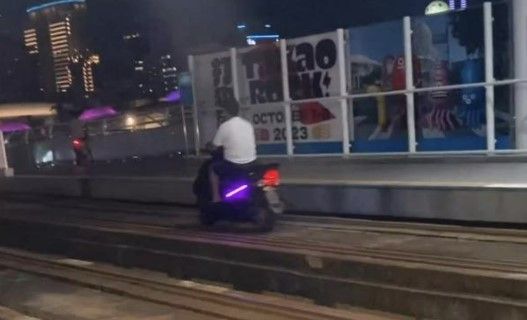 27日晚間8時許高雄一名40歲洪姓男子,在駁二藝術特區騎著未掛牌照的機車,並闖入輕軌軌道區,且一路沿著軌道騎至「真愛碼頭站」,接著自人行腳踏車道穿過愛河橋,抵達高雄流行音樂中心。
