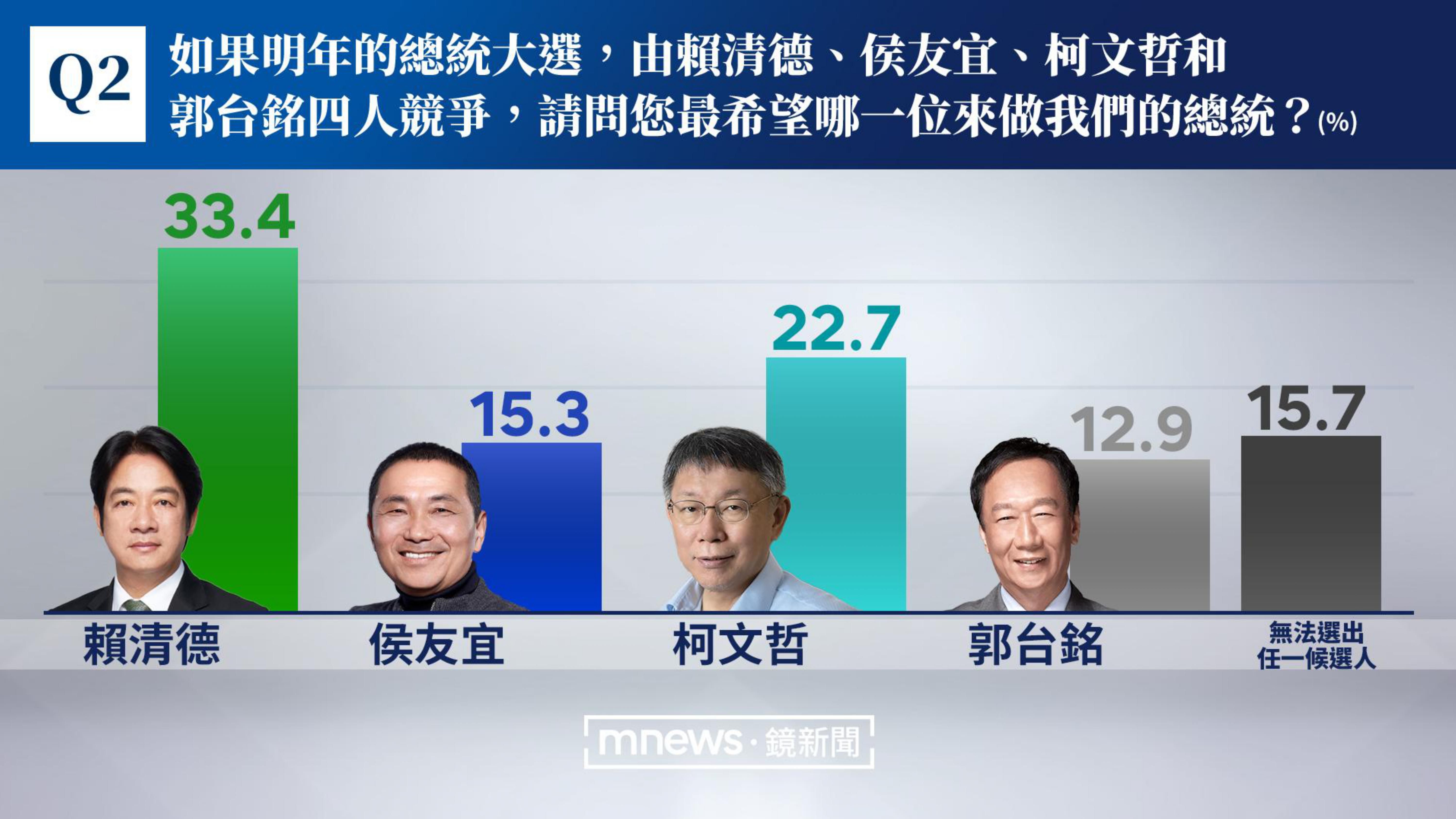 若為四組候選人的狀況下,賴清德仍穩居第一獲得33.4%的支持度、柯文哲支持度減少近五個百分點獲得22.7%的支持度、侯友宜支持度也降到15.3%、郭台銘墊底僅獲得12.9%支持度,與三組候選人的狀況相比,僅剩15.7%的民眾未做出決定。由民調可看出,賴、柯、侯三人中,郭台銘參選對柯文哲的民調影響最大,下降約5%的支持度。