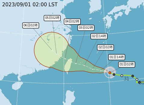 強颱蘇拉走了,但海葵颱風持續靠近,預估今(1日)上半天轉中颱,中央氣象局預測海葵可能從宜蘭、花蓮登陸,最快今天下午2點半或5點半發布海警,週六清晨可能發陸警,不排除颱風中心週日登陸,週末有颱風假機會。美國及日本模式預測海葵有機會撲台,歐洲模式則認為只會從台灣北部海面經過。