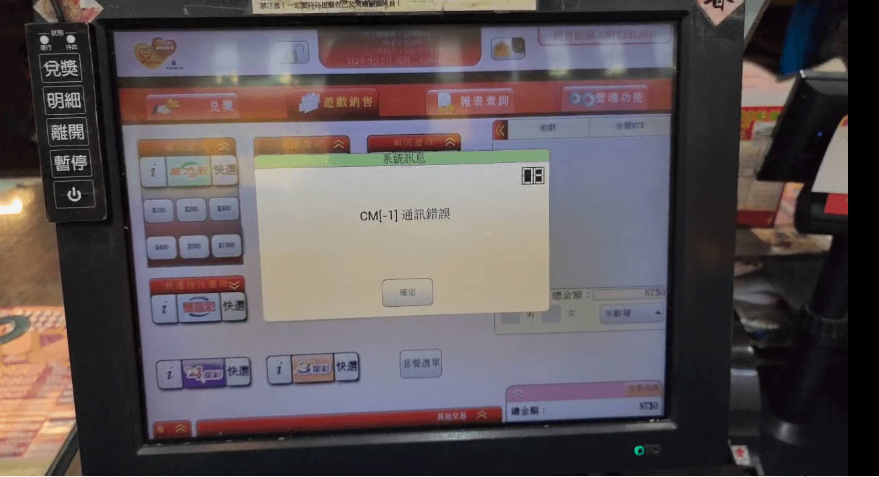 台彩才在今(5日)宣布中秋節加碼,不過全台的彩券行機台卻大當機!根據彩券行表示,大約在傍晚6點多,不少經銷商都出現機台當機情形,彩券行本來以為是自家機台的網路連線出問題,沒想到重新開機後,還是沒改善。經台彩搶修後,系統已於晚間7時13分陸續恢復,台灣彩券公司對此狀況造成不便深感歉意。