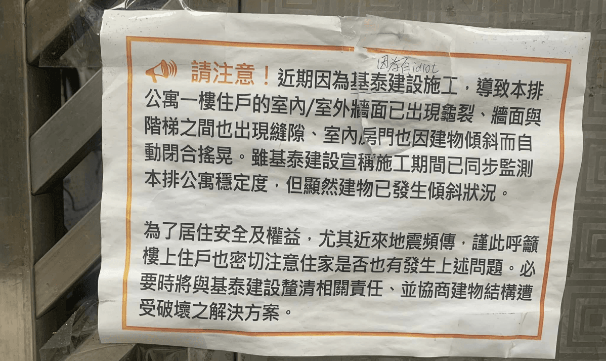 公告也提醒住戶,近來地震頻傳,為了居住安全及權益,呼籲樓上住戶密切注意家中是否也有同樣問題,「必要時將與基泰建設釐清相關責任,並協商建物結構遭受破壞之解決方案」,公告上還可見有人用原子筆將「基泰建設」畫線,並寫下「因為有idiot(白痴)」,可見住戶相當不滿。隨後,有一位自稱是受災居民表示這張公告是他所貼,「但這半年來市政府無視無能、甘為基泰建設背書做靠山,才導致今天讓我們住戶措手不及的結果」。