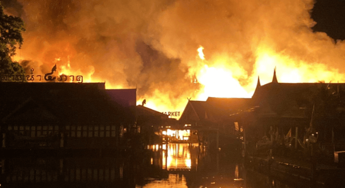 綜合泰媒報導,芭達雅四方水上市場當地7日晚間發生火災,從釋出畫面可見火勢十分猛烈,現場還不時傳出爆炸聲,由於市場多為木造建築、加上強風,火勢快速蔓延,兇猛大火瞬間將現場燒成一片廢墟,有兩人分別因吸入濃煙、輕微燒傷送醫,所幸治療後已無大礙。