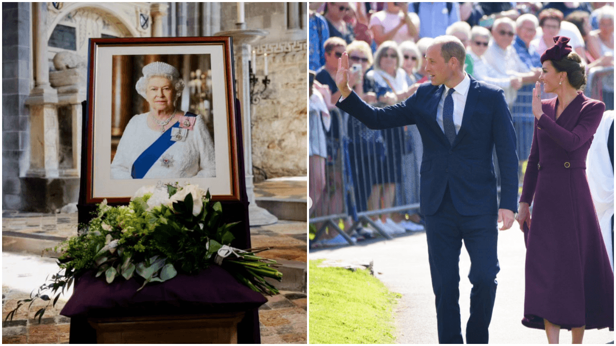 威廉王子與凱特王妃前往聖大衛大教堂,對著女王遺像追思,並一起獻上一束潔白的花朵,紀念女王為英國、世界各地所做的一切,威廉王子穿著西裝套裝,凱特王妃則是穿著一身酒紅色裙裝,2人表情嚴肅,看起來頗為悲傷。