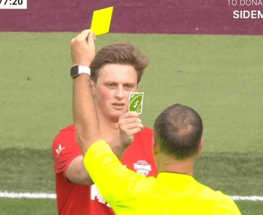 英國日前舉辦了一場慈善公益足球賽,由Sidemen FC足球隊對戰YouTuber明星隊,為了讓民眾們更加響應慈善捐款,網紅們無所不用其極,有一名英國YouTuber馬克斯(Max Fosh)在被裁判送出黃牌時,竟從口袋拿出卡牌遊戲UNO中的「迴轉卡」,讓全場觀眾嗨到最高點,連裁判也都止不住笑意。
