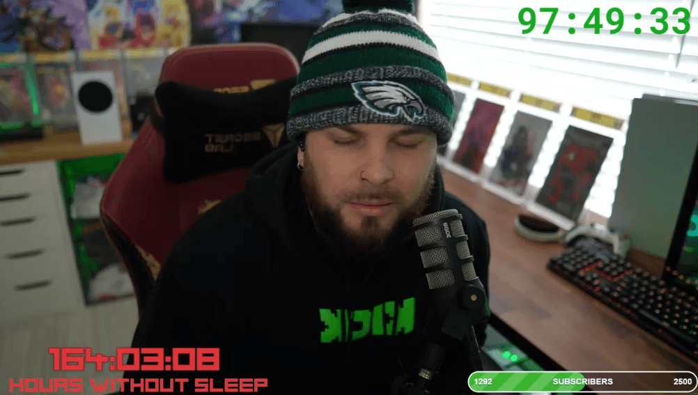 國外一名遊戲實況主發起「7天不睡覺只玩遊戲」的挑戰,連續直播164小時後因體力到達極限而中斷,雖未達成原先設定的目標,但已打破上一位挑戰者162小時不闔眼的世界紀錄,而他也在挑戰結束後累到立刻闔眼。