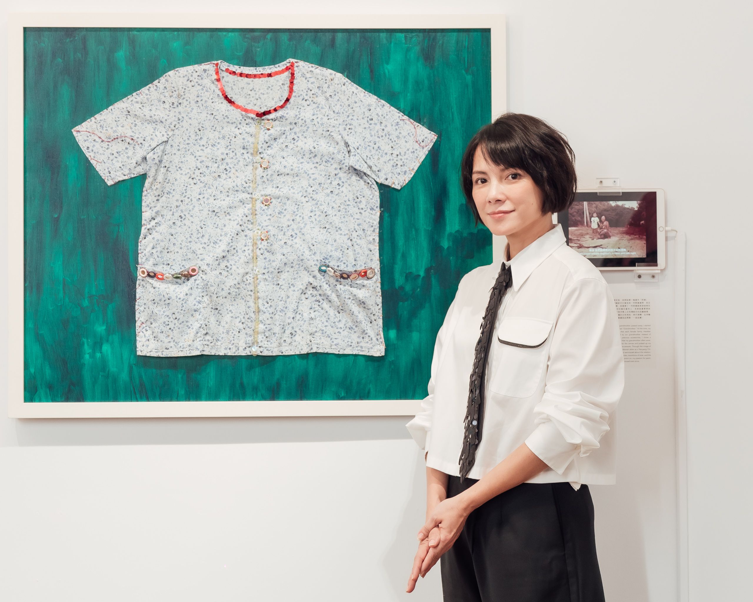 這是李心潔第二次在台灣辦畫展,她挑選了18幅作品展出,其中一幅《孩子與我》是她的雙胞胎兒子,半夜偷偷用顏料在她還沒完成的畫上塗鴉,她氣得把兩個兒子臭罵一頓。眼見無法修復,她只好轉念繼續畫完,當做與孩子一起創作的第一個作品,她並強調,這幅畫蘊含了一個學習放下的過程。另一幅《阿嬤》是李心潔的非賣品,當年她最親愛的外婆過世,因緣際會開啟了她畫畫的念頭,她特別用外婆遺留的一件夏衫縫在畫布上作畫,當做永遠的紀念。
