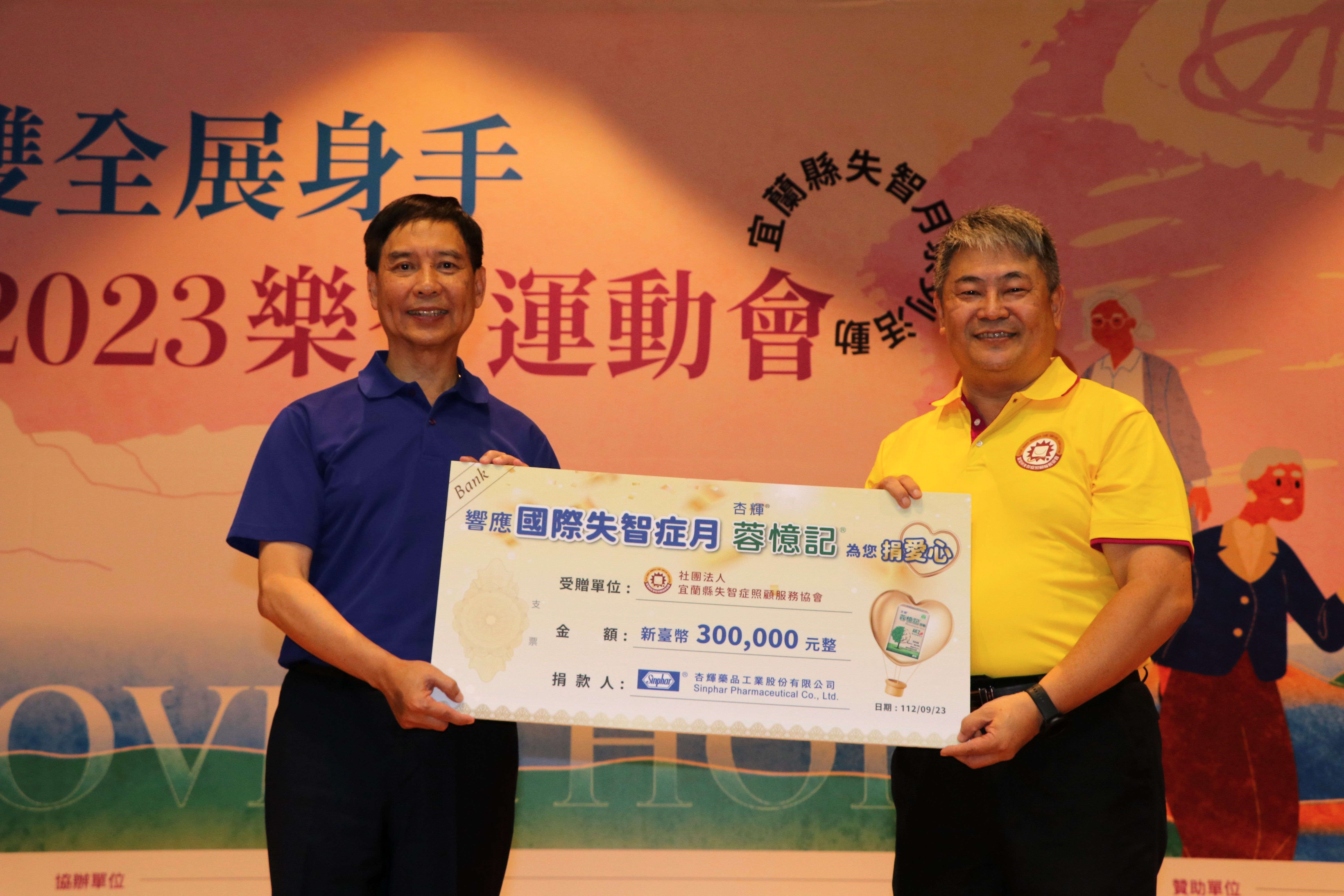 九月是國際失智症月,杏輝藥品在七月底發起「杏輝蓉憶記為您捐愛心」活動,消費者購買蓉憶記,杏輝藥品就相對提撥基金,近兩個月來吸引許多消費者熱情參與,杏輝總經理白友烺日前特別參加了宜蘭縣失智症照顧服務協會所舉行的「樂智運動會」活動,捐出30萬愛心款項,提供協會做為失智症照顧服務經費。