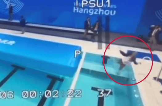 影片畫面顯示,25日在杭州亞運的游泳賽事場上,一名男裁判正背對著泳池與其他裁判講話,不過就在這時,他一個轉身,重心沒踩穩,不小心踉蹌跌落泳池中,其他裁判見狀趕緊將他扶上岸,雖然疑似有撞擊到手部及頭部,但看來沒有太大影響。