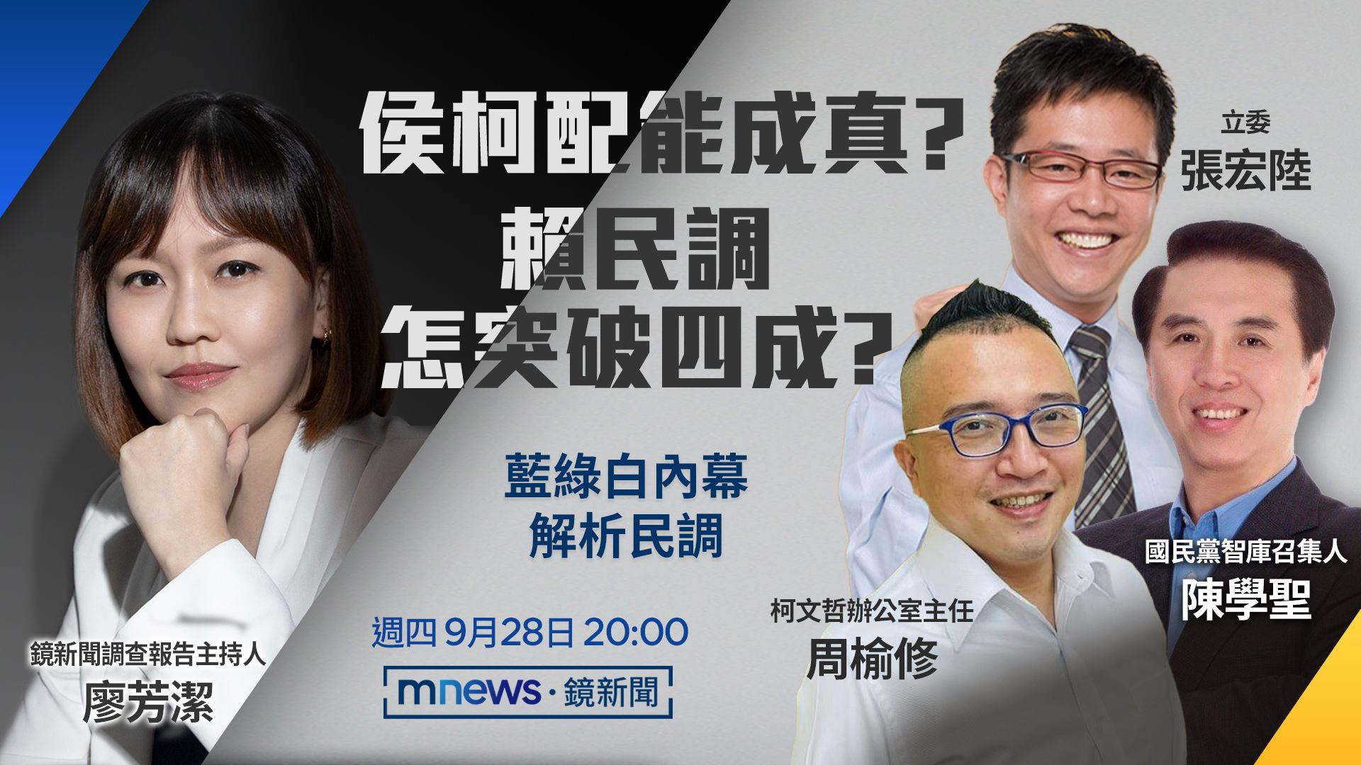 鏡新聞調查報告主持人廖芳潔邀請藍綠白重量級選將、幕僚, 一起解析這份民調,也曝光各陣營2024的最新戰略,請鎖定今晚(9/28)八點鏡新聞調查報告。