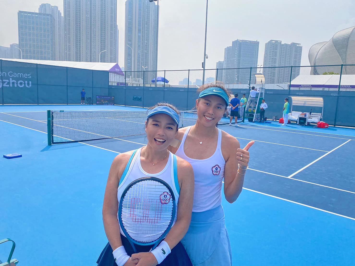 上屆雅加達亞運詹家姊妹收穫網球女雙銀牌,本屆杭州亞運再次進入決賽,對手同為台灣選手梁恩碩、李亞軒,雙方都對這場比賽相當期待,而且無論輸贏,都為台灣帶回一面金牌、一面銀牌。