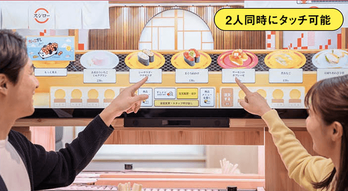 日本壽司郎9月27日趁著40週年,在東京新宿西口、大阪江坂等分店座位區設置1.5公尺寬、0.5公尺高的大螢幕,畫面中以迴轉壽司模擬畫面,讓顧客體驗虛擬點餐。