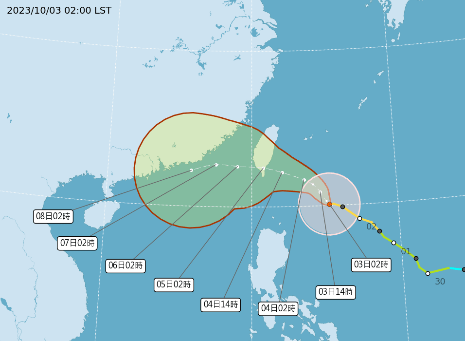 第14號中度颱風「小犬」,清晨5時距鵝鑾鼻東南東方約470公里之海面上,向西北轉西北西進行,登陸地點估為台東南側至恆春,並從高雄、屏東出海,預估週三、週四(4日、5日)對台灣天氣的影響最明顯,全台防豪大雨,東半部可能出現「紫爆」,即累積雨量超過130毫米,請做好防災準備。最快週五(6日)下半天解陸警,但迎風面仍有大雨發生機率。