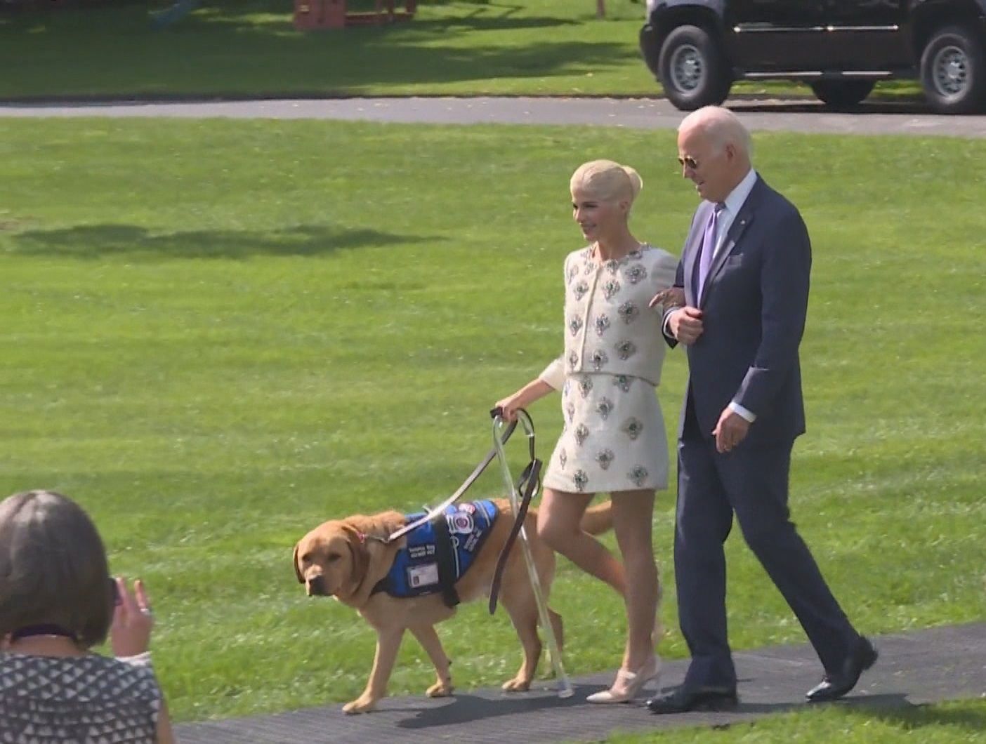 女星莎瑪布萊爾:「坐下。(拜登也佯裝想坐下)我突然覺得我好強大。」女星布萊爾在46歲時,被診斷出罹患多發性硬化症,成為《身心障礙者法案》的強力推動者,拜登邀請她到白宮,參加紀念會,但她的狗狗卻搶盡風頭,還舒服地靠在拜登腳邊,拜登也藉此機會,展現親和力。