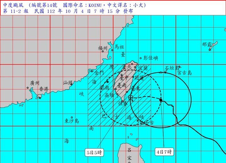 根據中央氣象署資料,中颱小犬今(4日)7時的中心位置在北緯22.1度,東經123.8度,即在鵝鑾鼻的東方約300公里之海面上,以每小時12公里速度,向西進行。,以每小時12公里速度向西移動,暴風圈已進入台灣東半部近海,對宜蘭、花蓮、台東、南投、苗栗以南及恆春半島將構成威脅,近中心最大風速每秒43公尺(約每小時155公里),相當於14級風,瞬間最大陣風每秒53公尺(約每小時191公里),相當於16 級風。