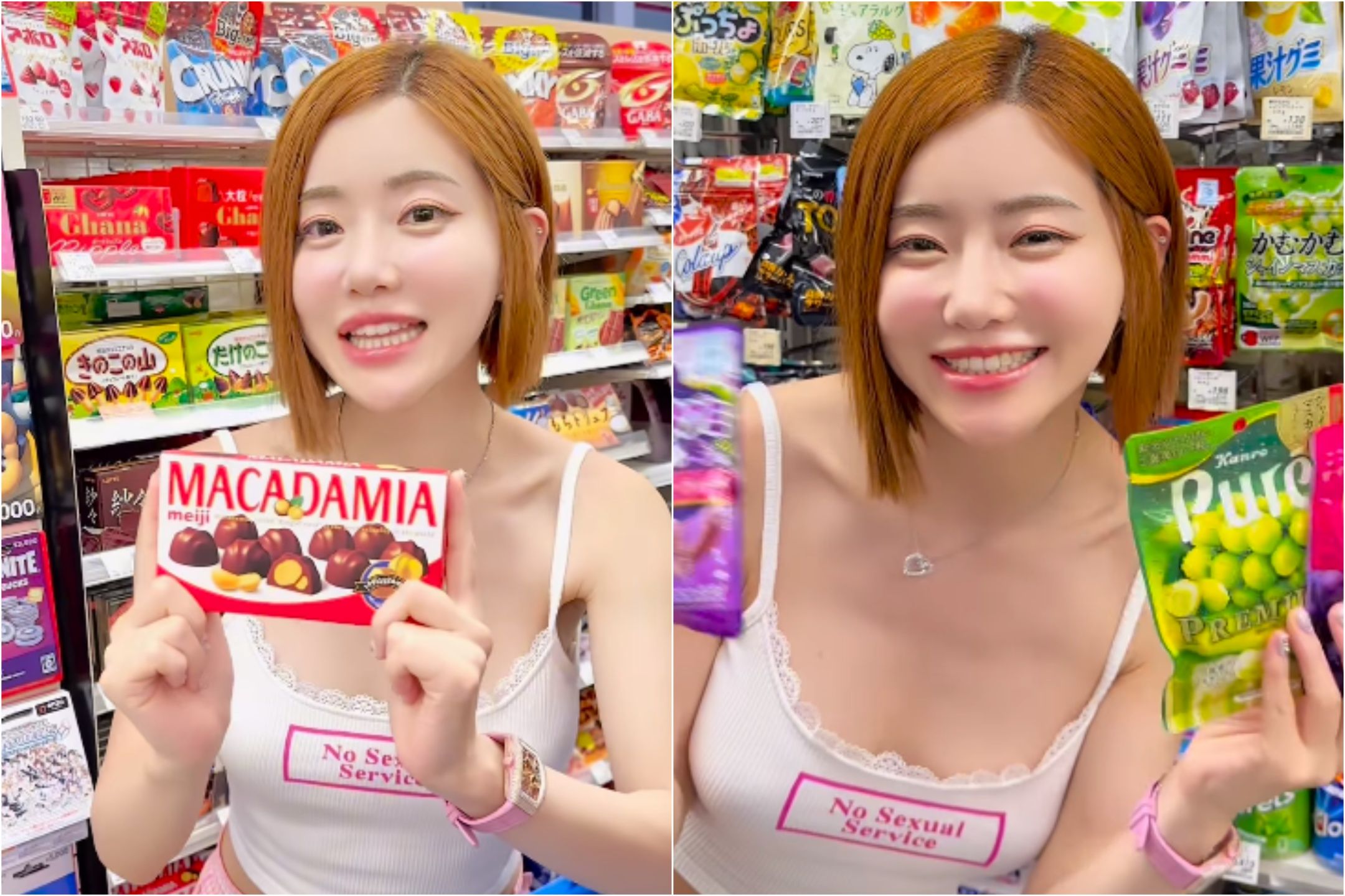 DJ SODA在經歷性騷風波後,日前再度到日本旅遊,並於IG分享當地街景、美食照,其中一段影片卻掀起熱議,她拍片介紹日本超商有哪些食物必買,但有日本網友注意到她穿的細肩帶背心胸前印有「No sexual service(不提供性服務)」英文字樣,認為DJ SODA是在暗指先前的性騷事件。