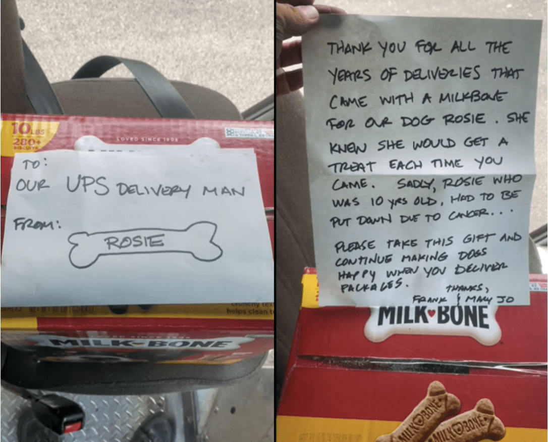 美國一名快遞員上班時只要遇到毛小孩,都會準備小點心給對方享用,日前他到汪星人朋友Rosie家送貨時,收到Rosie致贈的牛奶狗骨頭餅乾和一封信,殊不知這卻是「最後的禮物」,快遞員將故事分享到TikTok後惹哭大批網友。