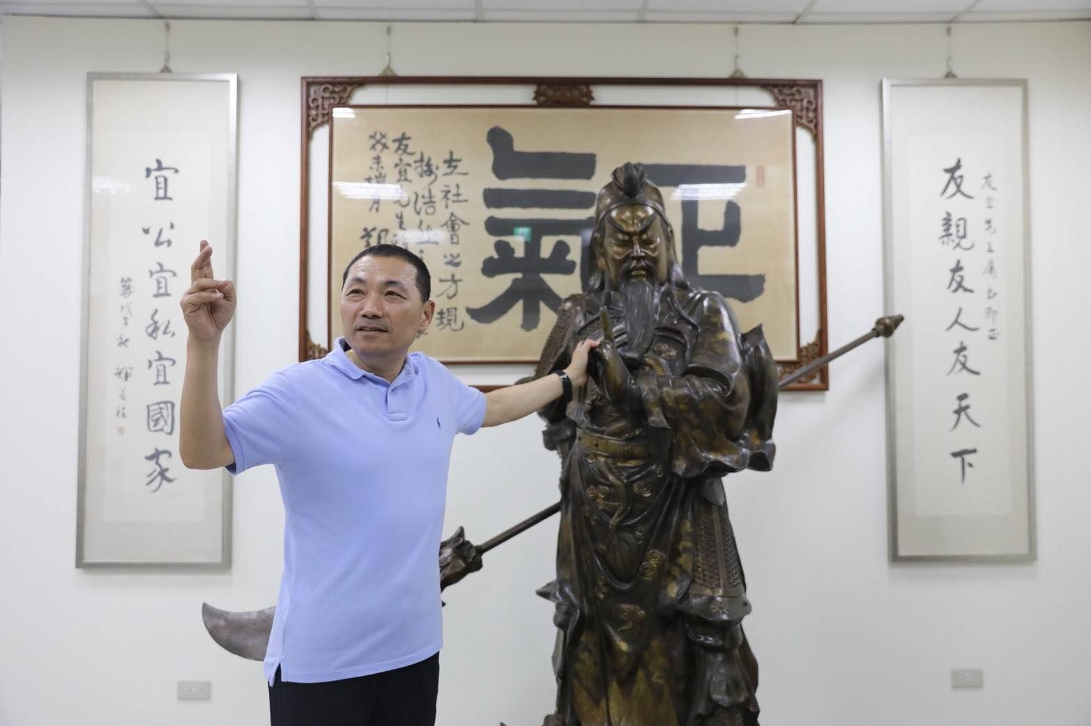 國民黨總統參選人侯友宜,多次公開宣示篤信關公,在板橋的競選辦公室也擺放關公雕像,今(17日)下午辦公室的關公像手持的青龍偃月刀卻突然掉落,發出巨大聲響驚動在場媒體;而青龍偃月刀掉落在民俗傳說裡被視為不祥預兆;另一位參選人郭台銘,同樣自稱是關公信徒,郭陣營發言人黃士修意有所指,稱關公顯靈「警告心術不正的某些人,勿冒用名義,謀害忠良」。